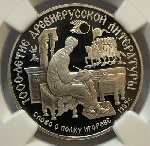 Платиновая монета 150 рублей "Слово о полку Игореве" 500-летие Единого Русского Государства 1988г., Pt 999, 15,55г., ЛМД в слабе NGC PROOF 70 ULTRA CAMEO