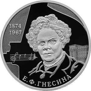 рельефное изображение портрета Е.Ф. Гнесиной на фоне силуэта рояля, обрамленного матированными областями и рельефным контуром, а также изображений здания Российской академии музыки имени Гнесиных и нотного стана с «музыкальным автографом» пианистки, выполненных в технике лазерного матирования; внизу по окружности – рельефная надпись «Е.Ф. ГНЕСИНА», в левой части монетного поля – надписи «1874» и «1967» в две строки.