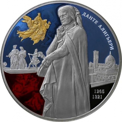 В центре диска – памятник Данте в Вероне, слева – Харон, перевозящий на лодке Данте и Вергилия, и фрагменты иллюстраций Г. Доре к "Божественной комедии", изображающих видения Ада (фигуры грешников на красноватом фоне внизу) и Рая (золотистые фигурки Беатриче и ангелов на синем фоне вверху), в правой части диска – церковь Санта Мария дель Фьоре c колокольней Джотто во Флоренции, под ней – даты в две строки: "1265" и "1321".