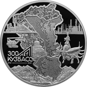 Серебряная монета 3 рубля "300-летие образования Кузбасса" 2021г., 31,1 г. 925 проба, ПРУФ