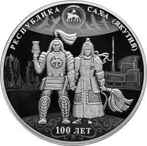 на зеркальном поле диска изображены мифологические герои якутского национального эпоса «Олонхо» — Ньургун Боотур и Туйаарыма Куо. Изображение фигур героев выполнено в рельефе на фоне видов природного парка «Ленские столбы» и современных архитектурных объектов Якутска. Вверху — изображения герба Республики Саха (Якутия) и силуэтов летящих стерхов. Имеются надписи, вверху вдоль канта: «РЕСПУБЛИКА САХА (ЯКУТИЯ)», внизу, на фоне национального орнамента: «100 ЛЕТ».