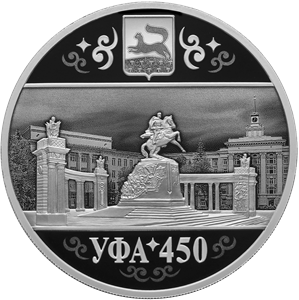 рельефное изображение герба города, изображение ансамбля Советской площади г. Уфы, выполненное в технике лазерного матирования, в рельефе – изображение памятника генерал-майору М.М. Шаймуратову, внизу – рельефная надпись «УФА 450». В верхней и нижней части монеты – элементы орнамента, выполненные в рельефе и в технике лазерного матирования.