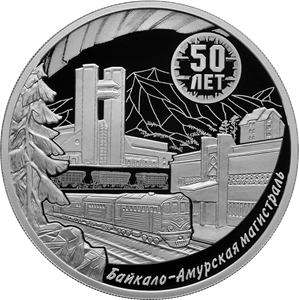 Серебряная монета 3 рубля "50-летие начала строительства Байкало-Амурской магистрали" 31,1г., Ag 925, 2024г., Proof