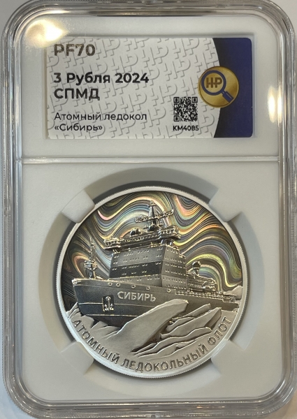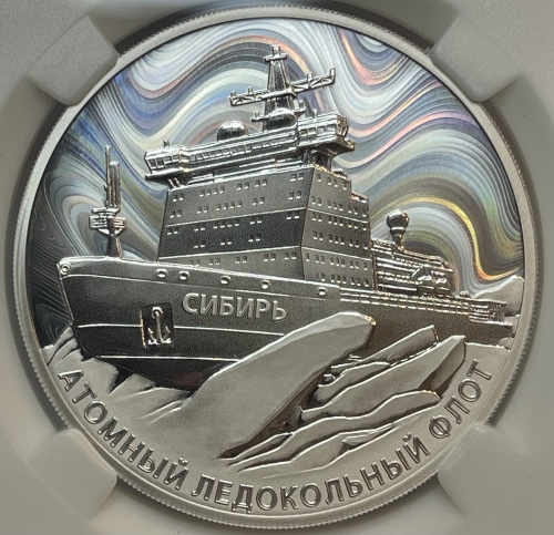 рельефное изображение атомного ледокола «Сибирь» и ледовых торосов на фоне изображения полярного сияния, выполненного в виде волнистых радужных линий с эффектом интерференции света; внизу по окружности – рельефная надпись «АТОМНЫЙ ЛЕДОКОЛЬНЫЙ ФЛОТ».