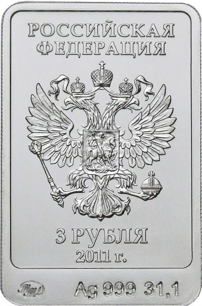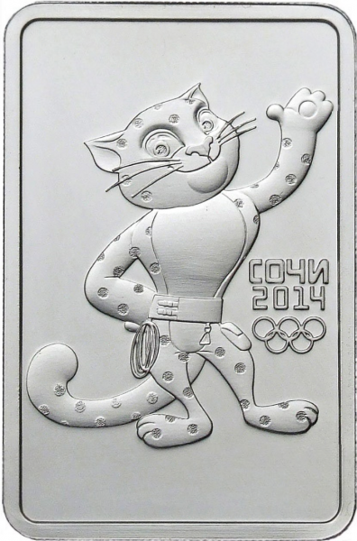 Серебряная монета 3 рубля Леопард серии XXII Олимпийские зимние игры и XI Паралимпийские зимние игры 2014 года в Сочи выпущена ЦБ России 27 декабря 2011 года. Монета имеет прямоугольную форму с закругленными углами. Леопард – официальный Талисман зимней Олимпиады 2014 в Сочи.