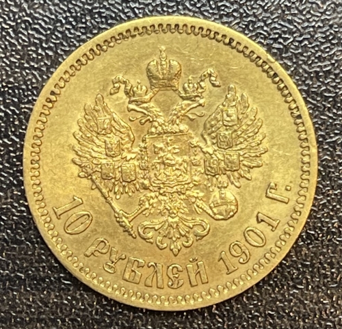 В центре изображен Малый Государственный Герб Российской империи - двуглавый орёл, головы которого увенчаны двумя коронами, третья, большая корона над ними. Все они соединены орденской лентой ордена Св. апостола Андрея Первозванного. На груди орла расположен Московский герб - щит с изображением Георгия Победоносца с копьём поражающего дракона. Вокруг щита цепь ордена Св. апостола Андрея Первозванного. На крыльях изображены гербы: Царства Казанского, Польского, Херсонеса Таврического, Астраханского, Сибирского, Грузинского и герб соединенных княжеств Киевского, Новгородского и Владимирского — по 4 на каждое крыло. В правой лапе орла – скипетр, в левой – держава. Под ним слева направо изображены: номинал - надпись «10 РУБЛЕЙ» и дата выпуска «1901 Г.». По окружности канта имеются рельефные элементы, выполненные в виде зубцов.