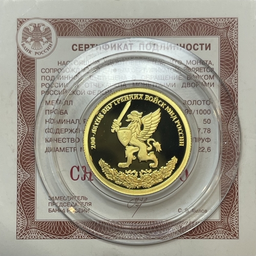 Золотая монета 50 рублей "200-летие внутренних войск МВД России" 2011г., 7,78 г., Au 999, ПРУФ, СПМД