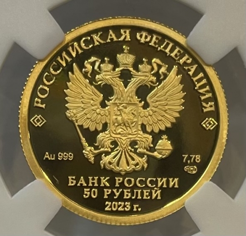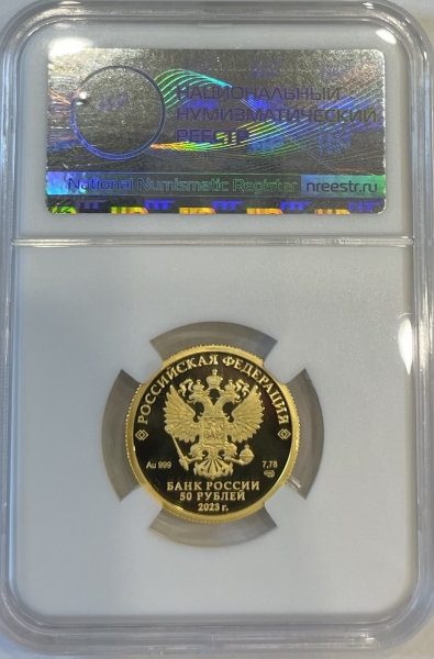 рельефное изображение Государственного герба Российской Федерации, над ним вдоль канта – надпись полукругом «РОССИЙСКАЯ ФЕДЕРАЦИЯ», обрамленная с обеих сторон сдвоенными ромбами, под гербом: слева – обозначения драгоценного металла и пробы, справа – содержание химически чистого металла и товарный знак монетного двора, внизу в центре в три строки – надпись «БАНК РОССИИ», номинал монеты «50 РУБЛЕЙ», год выпуска «2023 г.».