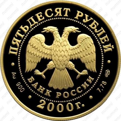 в центре диска - эмблема Банка России (двуглавый орёл художника И. Билибина, под ним надпись полукругом "БАНК РОССИИ"), обрамлённая кругом из точек и надписями по кругу: вверху - "ПЯТЬДЕСЯТ РУБЛЕЙ", внизу - "2000 г.", слева - обозначение металла, проба сплава, справа - содержание драгоценного металла в чистоте и товарный знак монетного двора.
