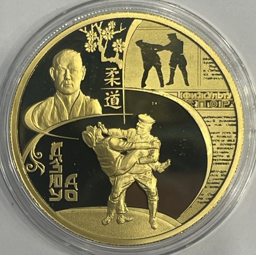 в нижней части диска – сцена применения милиционером приема дзюдо, слева – надпись: "ДЗЮУ ДО" стилизованная под японские иероглифы, вверху слева – портрет основателя отечественной школы дзюдо В.С. Ощепкова, справа от него – цветущая ветка сакуры и иероглифы, означающие "ДЗЮДО", в правой части диска – фрагмент газеты "Физкультура и спорт".