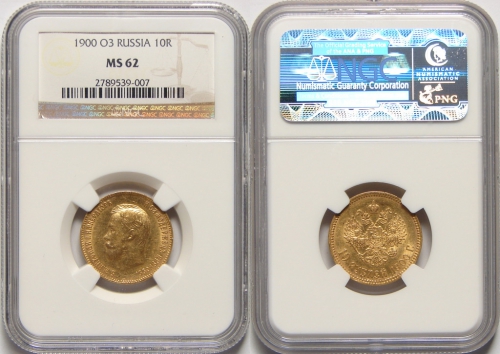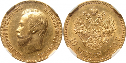 Золотая монета Николая II 10 рублей 1900 год состояние MS 62
