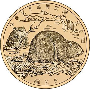 на фоне водной поверхности - два бобра, сооружающие плотину из веток, по окружности - надписи, вверху: "СОХРАНИМ НАШ", внизу: "МИР".