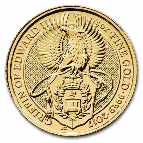 • Золотой Королевский Гриффон это вторая золотая монета в серии "Звери королевы" Монета 2017 года номиналами в 100 и 25 фунтов и весом в 1 и 1/4 тройскую унции. Монета продолжает серию десяти геральдических статуях, связанных с родословной королевы Елизаветы II.  Монета Королеский Гриффон Эдварда III состоит из геральдического зверя, находящегося над щитом, на котором изображены знаки связанные с королем Эдуардом III.  Щит стоит по центру монеты с циркулирующей надписью на левой стороне - GRIFFIN OF EDWARD III. Монета разработана Королевским монетным двором Великобритании, художник Джоди Кларк. Вес 1/4 унции составляет 7,8 грамма и диаметром 22 мм, при номинале 25 фунтов. Чистота золотых монет 999,9.